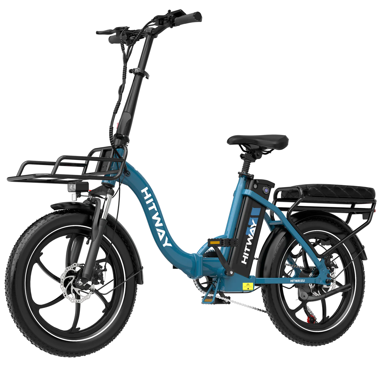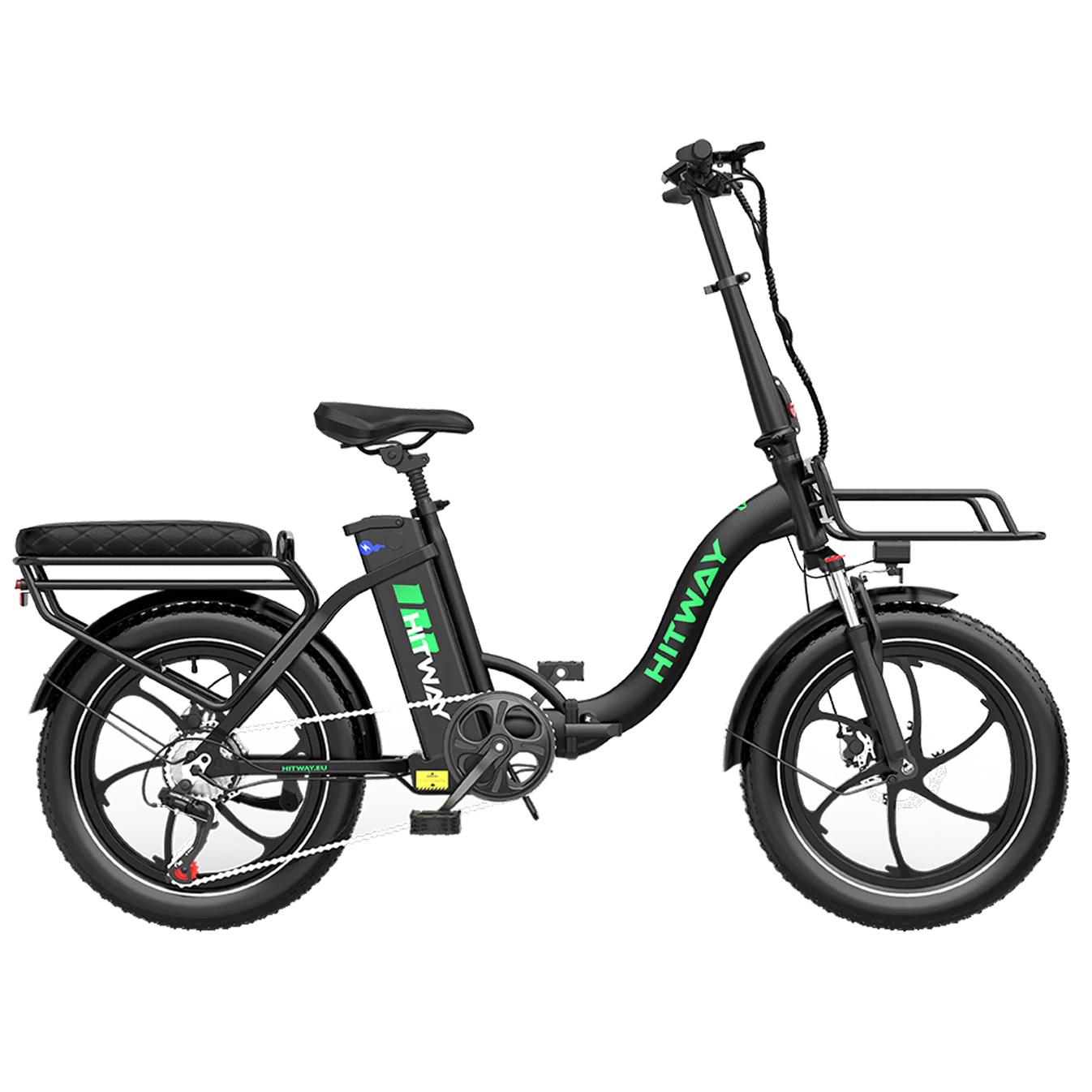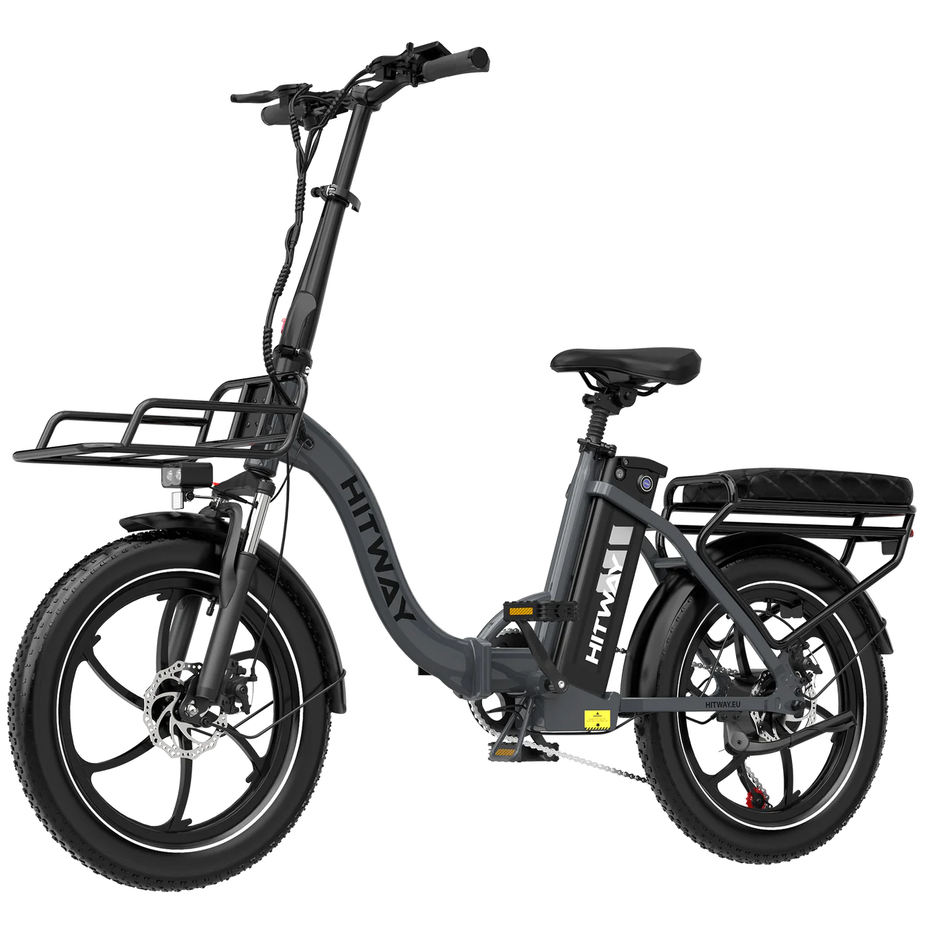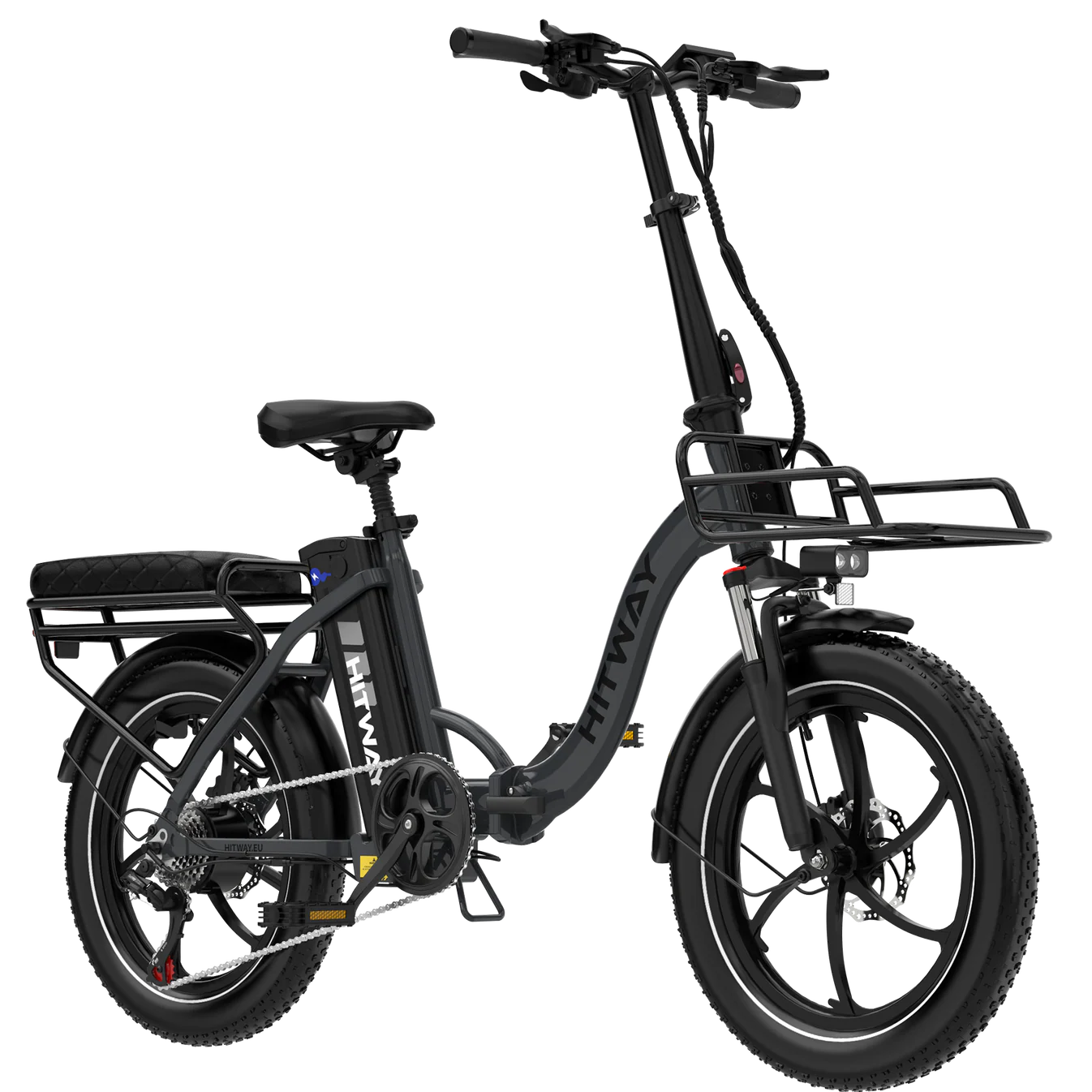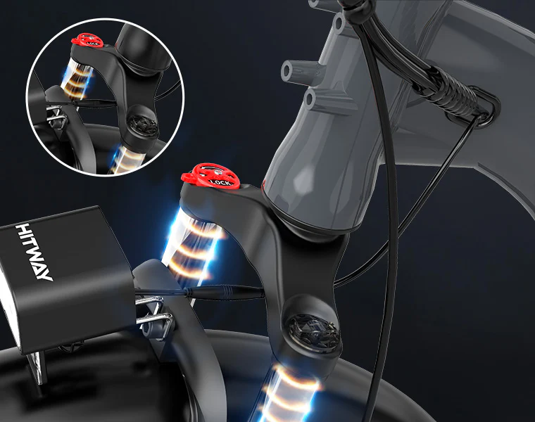 The HITWAY e-bike is equipped with a suspension fork with a lockout function, allowing you to switch between comfortable damping on rough terrain and a rigid fork for efficient riding on flat roads. This ensures optimal control and riding comfort at all times.