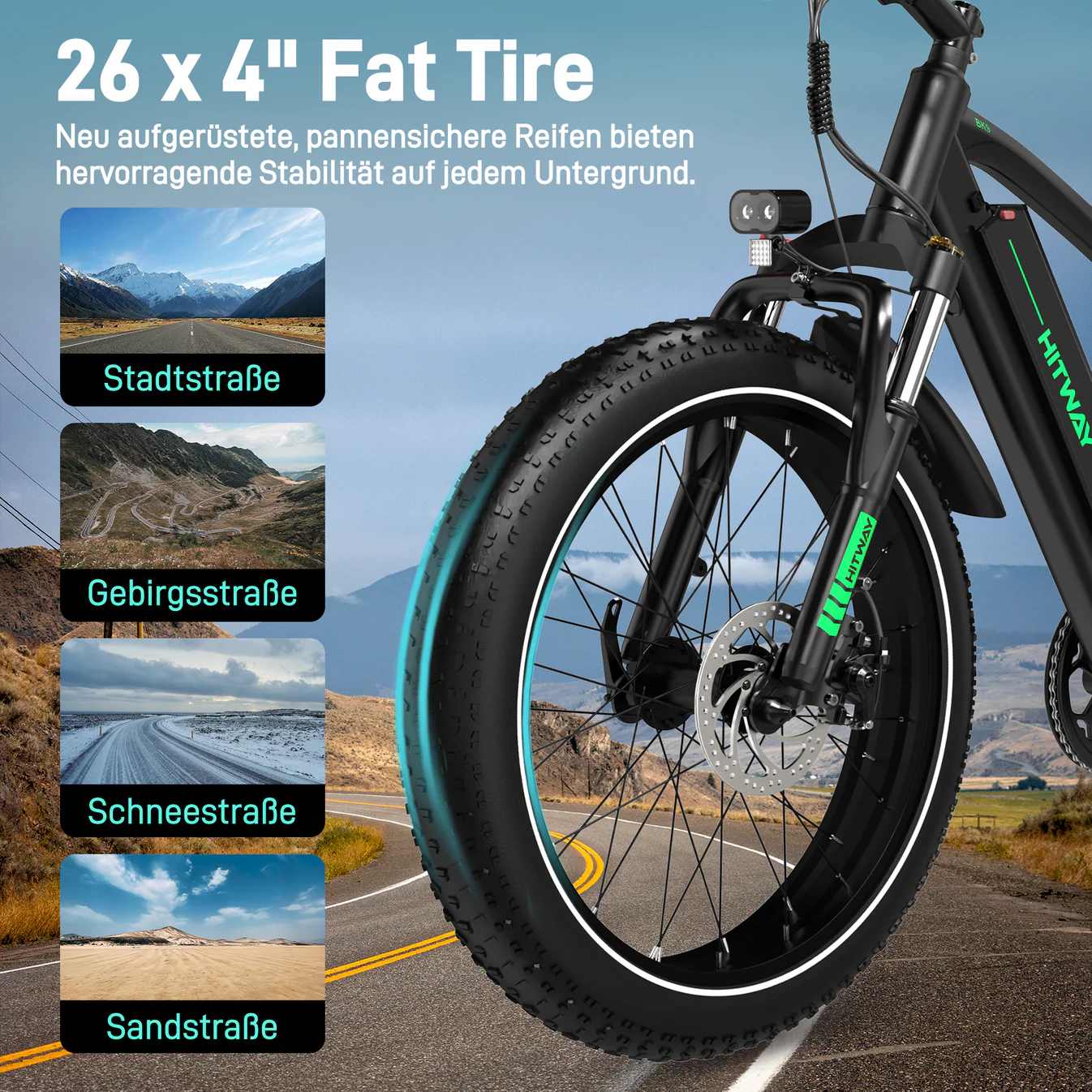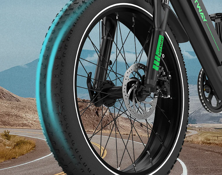Equipped with large 26×4.0-inch tires, the e-bike is designed to conquer any terrain. Whether on sand, snow, gravel or asphalt, these wide tires offer excellent grip, stability and comfort for a smooth and controlled ride in all conditions.