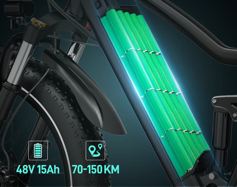 The HITWAY BK9S e-bike is equipped with a removable 48V 15Ah (720Wh) battery, allowing for easy charging anytime, anywhere. Depending on riding conditions, a full charge provides a range of 70 to 150 kilometers, meeting your mobility needs. Additionally, the battery is equipped with a lock for increased theft protection.